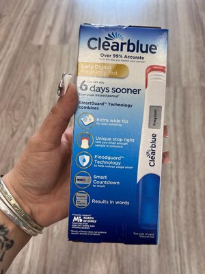 The Clearblue Early Digital Pregnancy Test is our most sensitive digital home pregnancy test[4], delivering results up to 6 days before you miss your period[2]. Once the test is running, the Smart Countdown will appear on screen to reassure you the test is progressing, counting down to your clear digital result in words, within just 1-5 minutes. Each pack includes 3 individually wrapped digital pregnancy tests that detect the "pregnancy hormone" (hCG), which starts showing up in your urine shortly after implantation. This early pregnancy test is easy to grip and has an extra-wide tip for easy urine sampling. Plus, it features a digital display that gives clear results ("Pregnant" or "Not Pregnant"). Over 99% accurate[1], you can feel confident in your results.