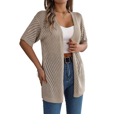 Embrace the fresh spring styles with this 2026 Pointelle Knit Cardigan for Women, featuring an elegant open front design perfect for layering over your favorite outfits. The intricate pointelle knit pattern creates a beautiful hollow-out effect that adds texture and visual appeal while maintaining a lightweight feel. This short sleeve sweater cardigan offers versatile coverage that works well during transitional weather months. Made from 100% viscose, the fabric feels soft and breathable against your skin, providing comfortable wear throughout the day. The open front allows for easy styling over tank tops, dresses, or blouses, making it a practical addition to your wardrobe. Available in multiple color options to suit different preferences, this cardigan drapes gracefully and moves with your body. The material maintains its shape and quality with proper care, feeling gentle on your skin during extended wear. For maintenance, we recommend washing in a laundry bag using a gentle machine cycle or hand washing to protect the delicate knit pattern and fabric structure. Whether you're attending brunch, shopping with friends, or enjoying outdoor activities, this cardigan provides the perfect balance of style and comfort for your spring fashion needs.