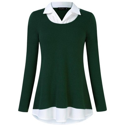 Clearlove Women's Casual Contrast Collar Shirt Long Sleeve Slim Fit Tunics Top dark green X Large