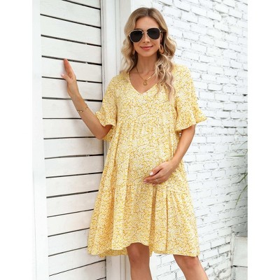 Product Name: Clearlove Women's Chicken Heart Neck Short Sleeve Printed Comfortable Stylish Maternity Crop Dress - Yellow floral,Medium