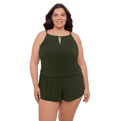 - Ruffle neckline, plunging V neck one piece, plus size fit