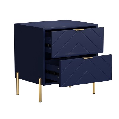 Add modern elegance and smart storage to your bedroom with this 2-Drawer Nightstand. Featuring geometric surface detailing and shiny gold handles, it brings a fashionable touch to any space. Two spacious drawers keep your essentials organized, while the rounded edges and reinforced metal legs offer both safety and stability. Available in four stylish colors.