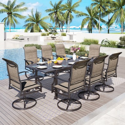 Captiva Designs 9pc Patio Slat-top Metal Dining Table & Grayish Brown Padded Textilene Swivel Chairs