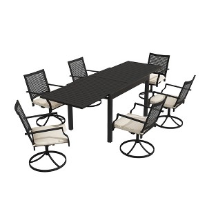 Enjoy flexible outdoor dining with this 7-piece patio set, featuring 6 swivel chairs and an extendable table. Built with rust-resistant metal and breathable Textilene fabric, it offers lasting comfort and space-saving convenience—perfect for hosting 4 to 10 guests in style.
