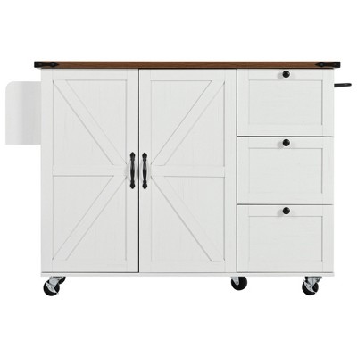 CLIHOME Farmhouse Kitchen Storage Island with Power Outlet, 2 Sliding Barn Door, Spice Rack, Rolling Kitchen Cart on Wheels, White