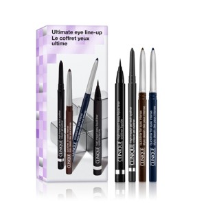 Clinique’s Ultimate Eye Line-up Makeup Set features four eyeliner essentials to create any look, from winged to smudged and smoky. High Impact™ Gel Tech Eyeliner is a color-rich, waterline-safe gel pencil that glides on smoothly and stays put—for 24hr wear on lids, 12hr on waterline. Features two shades of Quickliner™ For Eyes Intense Eyeliner, a richly pigmented, automatic pencil liner and smudge tool in one. High Impact™ Easy Liquid Eyeliner has all the drama of a liquid eyeliner, without the drama of putting it on.