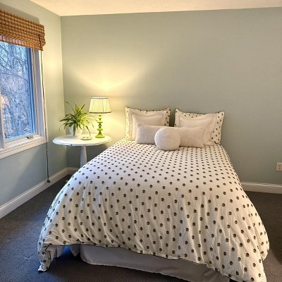 A: Hello Judy - Thank you for your interest in the Clip Dobby Comforter from Hearth & Hand with Magnolia. The King comforter in cream in color featuring sage green patterns. Happy shopping! - Cynthia