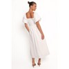 Falling gracefully to a midi length, the dress features a trendy square neckline and short puff sleeves with gentle elasticized cuffs, offering a modern take on a classic silhouette.