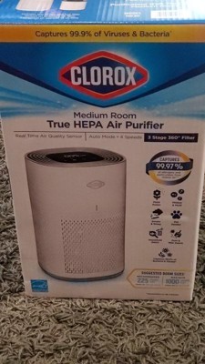 Clorox® is a trusted brand for powerful cleaning and has helped families for over 100 years. The Clorox™ Medium Room Air Purifier builds on our trusted legacy by helping you protect your family from allergens, pet dander, dust, smoke, viruses, bacteria and more. It captures 99.97% of allergens and particulates* and 99.9% of viruses and bacteria** so you can breathe easier. The 3 stage 360° filter delivers 360° air purification by capturing particulates in 3 filters: a pre-filter, True HEPA filter and active carbon filter. You'll always know your current air quality because the PM2.5 digital display and color-coded light provide real-time feedback. To keep your air clean around the clock, select the auto mode and walk away — it automatically adjusts to the ideal fan speed in response to changes in your air quality. The Clorox™ Medium Room Air Purifier is CADR-rated for excellent air purification that you can count on, with a 148 CFM (cubic feet per minute) for smoke, a 154 CFM for dust and a 160 CFM for pollen. Energy Star certified. Includes 1 Clorox™ filter that lasts 6-12 months.***