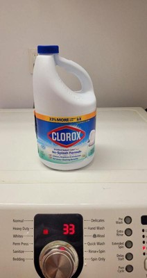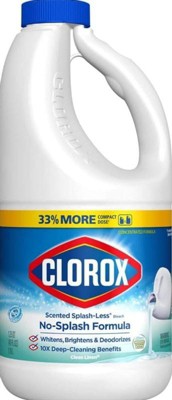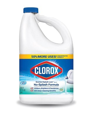 Make cleaning day a little more pleasant with Clorox No-Splash Liquid Bleach in Clean Linen scent. With a thicker formula, this splashless bleach delivers a controlled pour with less spilling and splashing so you can confidently clean house and laundry. Keep Clorox bleach on hand with your cleaning supplies to eliminate mold and mildew, whiten, brighten and deodorize. It offers 10x deep cleaning benefits, removing tough stainslike red wine, grass, dirt and bloodfrom white clothing. Plus, this cleaning and laundry bleach kills 99% of viruses and bacteria, leaving behind a classic linen scent as it cleans. Clorox cleaning bleach is an ideal addition to your kitchen and bathroom cleaning supplies. Dilute this bleach liquid with water to create a bleach cleaner that cleans and deodorizes a variety of surfaces, like floors, countertops, toilets, and kitchen and bathroom sinks. Or, use Clorox bleach with your regular detergent in a standard or HE washer. Start clean with Clorox. USAGE DIRECTIONS: For laundry: Sort laundry by color. Add detergent. Fill bleach to max line in dispenser or add 1/3 cup bleach to wash water. Add clothes and start wash. For best results, add to wash 5 minutes after the wash cycle has begun. Avoid bleaching wool, silk, mohair, leather, spandex and nonfast colors. For cleaning and deodorizing: Pre-wash surface. Mop, wipe or spray with bleach solution (1/3 cup bleach per 1 gallon of water). Allow surface to remain visibly wet for 6 minutes. Rinse well and air dry. CAUTION STATEMENTS: CAUTION: Irritant. Avoid contact with eyes and skin. First Aid: Immediately rinse with water for 15 minutes. Skin: rinse with water. In all cases: if irritation persists, call a doctor. Keep out of reach of children and pets. Do not use or mix with other household chemicals such as toilet bowl cleaners, rust removers, acids or ammonia-containing products, as hazardous gases may result.