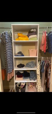 [This review was collected as part of a promotion.] Okay, I’ll start by saying this was NOT easy to put together. Unfortunately, the instructions I received did not match the included hardware/parts. Even worse, the hardware was just sort of thrown together and not labeled. So, I just tried my hardest to use the parts that best matched. The wood was not great quality and split VERY easily. Luckily, some sandpaper I had laying around helped repair the split holes just enough so that I could finish the assembly. I do like how much control you have over the adjustment of the shelves. They are also obviously very sturdy and would be able to hold any typical shelf item in my home. As a single woman living in a small house, however, it was disappointing that this is definitely not intended to be versatile/moved easily. You need to be ABSOLUTELY sure you like the location before you drill with the closet rods. I intend to use this as an extension of closet in my guest bedroom, however you could fit it in other smaller spaces if you have a saw, etc. Overall, I’m not sure the usefulness of this product made the difficult assembly worth it.