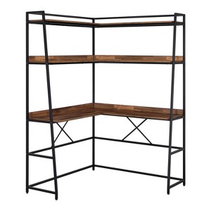 Conserve space without sacrificing full functionality with this corner desk. The urban design is propped by a matte black coated steel frame with a ladder style. The desktop features USB ports and power outlets for seamless tech compatibility, while lipped shelves stack above.