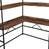 Conserve space without sacrificing full functionality with this corner desk. The urban design is propped by a matte black coated steel frame with a ladder style. The desktop features USB ports and power outlets for seamless tech compatibility, while lipped shelves stack above.