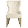Enjoy an intriguing silhouette with a classic look. Graceful curves and angles form an eye-catching design in this dining chair. Perfect for transitional spaces, its modern design is softened with lovely beige upholstery and tufting on its seat back. Individually hand-applied nailhead trim infuses charm and style. Beautifully contrasting legs in a warm brown finish add a balanced look with curves and tapers