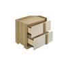 Complete your bedroom's modern elegance with this exquisite nightstand, perfectly designed to match your stylish bed. Inspired by contemporary Italian design, the nightstand features a sleek blend of natural wood tones and crisp white panels crafted from durable, easy-care melamine. The drawers, equipped with metal extension glides and pin-construction joinery, ensure smooth operation and lasting durability. The vertical lines of the natural finish hardware add a touch of sophistication, echoing the bed’s elegant design. Enhance your nighttime routine with this stylish and functional piece, offering a perfect blend of beauty and practicality.