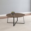 Augment an inviting living space with the stylish look of a modern round coffee table. It pairs a round top with a dimensional grey finish, creating a sense of lightness. The table's base features a pair of intersecting U-shaped frames, complete with bracket details that add industrial charm to the table top. A black finish on the metal base adds contrasting dimensionality. The table top itself is melamine, adding resistance to minor damages for a lovely look that lasts.