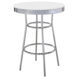 Reminiscent of a 50s soda fountain, this bar table offers a variety of uses. It's perfect for a handy place to prop drinks or snacks. Its sleek design gives you the flexibility to move around freely. A high-shine chrome base and white table top will allow you to enjoy your breakfast and morning coffee in style. Pair it with matching chrome barstools to further accent your space.