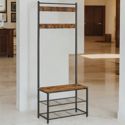 Keep your entryway organized with this Industrial Hall Tree Coat Rack with Shoe Bench. Featuring a sturdy MDF wood-look finish and heavy-duty steel frame, it offers lasting stability and safety with wall-mount options. The spacious bench supports up to 300 lbs, while 8 hooks and a hanging bar hold coats, bags, and accessories. Extra shelves provide ample shoe storage, keeping clutter out of sight. Rustic yet functional, it’s perfect for entryways, laundry rooms, or closets. Easy assembly with all tools included.