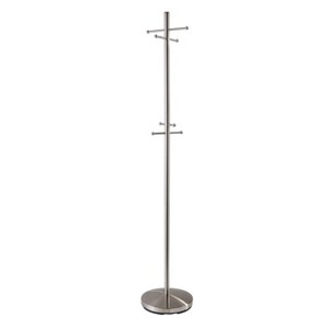 Whether you're a minimalist, modernist, or just need a place to hang your coat after a long day, this coat rack presents a simple design packed with function. Four hooks on two levels each hold plenty of items. The brushed steel finish suits contemporary and transitional décors, crafted with quality metal held by a weighted 13" round base. Measuring at 67"and weighing just over 16 pounds, it's a perfect compact touch to tie together any room you choose or even an office.