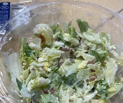 Love this salad. For the $3.19 price tag it fits the bill for a quick and light and cheap lunch. Can easily bring some crackers or pretzels or fresh fruit if you need a little more to get you through the day. Love that their salad bowls even come with a fork (it’s small but it does the job if you forgot one at work.) Especially love how everything is portioned out into its own sections on the tray to help keep it fresh and on the chance someone doesn’t want the egg or bacon they can choose not to mix it into the salad. Dressing is good and tasty (can always use more though!) Can get 2 of these and put into a larger bowl for a nice dinner salad for under $7. Can’t beat that!