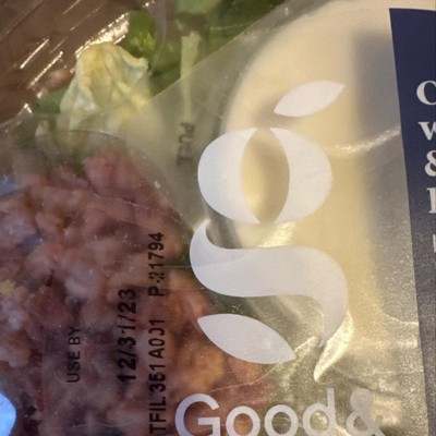 Even in the middle of your busy day, it's easy to treat yourself to a delicious and satisfying lunch with the help of this Cobb Salad Bowl from Good & Gather™. Featuring all the delicious flavors and textures of your favorite restaurant salads in one convenient and ready-to-eat bowl, this prepared grab-and-go salad makes a perfect pick for a packed lunch or grabbing a quick bite while running errands. The convenient salad bowl includes grilled white meat chicken and uncured bacon on a bed of crisp iceberg and green leaf lettuce, topped with hard-cooked egg and included blue cheese dressing for a savory and satisfying mix of flavors and textures. Plus, this ready-to-eat salad bowl even includes a fork so you can enjoy right away wherever you are.