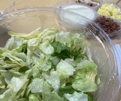 - Includes iceberg and green leaf lettuce blend, Grilled while meat chicken, hard-cooked egg, and uncured bacon