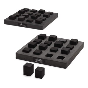 Each CobbleFoam board is constructed of a 16” x 16” EVA foam base with non-slip bottom and includes 16 durable foam blocks: 8 short (2¼” high), 8 tall (2¾” high). Blocks can be moved to form different patterns to vary challenge level.