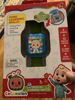 Little preschoolers can always count on JJ with the CoComelon JJxe2x80x99s Learning Watch. Inspired by the hit educational YouTube Kids and Netflix series, CoComelon, this interactive toy watch allows children to engage in their own early learning adventures with JJ wherever they go. Help spark your childxe2x80x99s creativity while discovering core learning and developmental skills through play. Children can start their day off with a friendly wakeup call from JJ! Featuring an alarm clock, stopwatch, animated character watch faces, and fun learning games, kids will love learning how to tell time, count, and accomplish daily activities as they receive reminders throughout the day. This learning watch is great for teaching your child time management skills and features three fun games including Count the Stars, Catch the Bones, and What Animal Makes What Sound? Toddlers will love popping open the cover and customizing their watch with the 12 different animated characters. It even features a kid-friendly, chunky design and stylish band that can be personalized to fit securely around little wrists. This play watch is great for developing fine motor skills, encouraging reading and talking, cognitive learning, social emotional skills and creativity through imaginative play. Featuring an authentic smart watch design, children will feel like a real grown up as they play and learn with JJ whenever they go! Bring home the CoComelon JJxe2x80x99s Learning Watch as well as the rest of the CoComelon toys and block construction sets to help make your little learner Happy & Smart! Requires 1 x CR2450 battery (included). Ages 3+