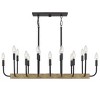 Embrace modern farmhouse style with the Coda linear chandelier. Sleek, elongated candle sleeves rise from a distressed, rectangular wood accent piece for a touch of industrial whimsy. A matte black finish completes the unique look, making Coda the perfect choice over any kitchen island, bar area, or table.