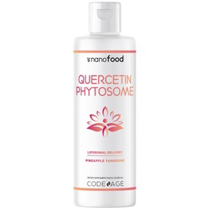 Codeage Nanofood Liquid Quercetin Phytosome supplement features 1000mg of quercetin phytosome from Sophora japonica extract in a vegan liposomal blend per serving. This liquid formula also includes Vitamin E as D-alpha tocopherol. Each bottle provides a 3-month supply in a pineapple tangerine flavor.
