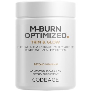 Codeage M-Burn Optimized supplement features a targeted blend of decaffeinated green tea extract standardized to 50% EGCG, berberine HCl, alpha-lipoic acid, vitamin B12 (as methylcobalamin), and a probiotic blend including Akkermansia muciniphila.
