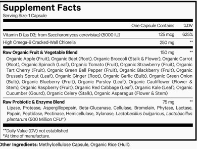 Beyond essential Vitamin D, this all-in-one vitamin D3 capsule supplement is infused with high Omega-9 cracked-wall chlorella, beetroot, carrot, celery, and tomato, crafting a dense nutritional mosaic.