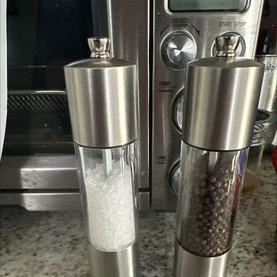 These mills are so sleek and modern! I love the stainless steel look that goes with all of my kitchen appliances and it helps that I can see how much salt & pepper I have left. I can even jazz it up and use fancy spices like Himalayan salt! Really easy to twist the top to change the grind settings. I use it near my stove and can easily transition to my table when eating. Love it!