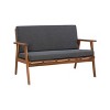 cushions are made of performance fabric that resist fade and damage from the elements. The frame is built from acacia wood that is oil stained in a traditional walnut finish. Two ample chairs combine with the compact sofa and outdoor coffee table to create a cozy chat set perfect for any outdoor event.Bench:Overall Width: 48.82”Overall Depth: 29.37”Overall Height: 30.87”Seat Width: 44”Seat Depth: 20”Seat Back Width: 44.25”Seat Bottom Width: 44.25”Arm Length: 25.5”Width Between Legs: 46.5”Floor to Seat Height: 13.5”Floor to Arm Height: 23.75”Floor to Cushion Top Height: 16.5”Floor to Seat Bottom Height: 11”Seat to Arm Height: 10.25”Chair:Overall Width: 27”Overall Depth: 29.37”Overall Height: 30.87”Seat Width: 22”Seat Depth: 20”Seat Back Width: 22.125”Seat Bottom Width: 22.125” Arm Length: 25.5”Width Between Legs: 24.5”Floor to Seat Height: 13.5”Floor to Arm Height: 23.75”Floor to Cushion Top Height: 16.5”Floor to Seat Bottom Height: 11”Seat to Arm Height: 10.25”Table:Overall Width: 35.43”Overall Depth: 22.44”Overall Height: 14.57”Leg Height: 13.75”Width between Legs: 34.5”Depth between Legs: 21.45”