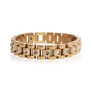 Our Coleen Bracelet has a statement-worthy watch link, featuring repeating hinge links sparkling with round cut stones nestled inside. Elevate any stacked bracelet look with our brightly polished watch bracelet for a modern yet classic style. A smooth interior lends comfort to this chunky bracelet.