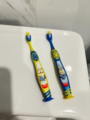 Colgate Kids Minions Manual Toothbrush is suitable for children 6+ years of age & above, It has extra soft bristles, Unique soft tongue clearner, suction stick for easy and fun upright storage, Thumb grip and rounded handle. My kids love the minions character.
