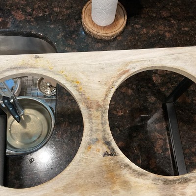 This is a really pretty raised bowl set however, the wood is not finished so it stains easily and started growing mold all over it. Thankfully I contacted customer service and they refunded me. I had to throw it out.