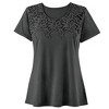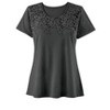 I'm extremely pleased with this attractive, comfortable cotton-knit top. I chose the color "Lavender," and it's a beautiful deep-medium jewel-tone purple. The lace yoke elevates this otherwise simple tee from “everyday plain” to “dressy casual.” I was happy that the lace isn’t see-through, but is overlaid over the solid knit. I couldn’t tell for sure from the product images. The fabric, though cool, feels substantial, and the short sleeves hit 5' 3" me right at mid upper arm. The fit is generous, but not baggy. My usual XL is a mostly good fit, though it's a bit roomy in the neckline-shoulder area, even though I'm broad-shouldered. This top is a bit on the spendy side for a cotton tee, but it’s well worth it, in my opinion.