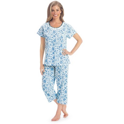 This Stylish And Comfortable 2-Piece Knit Pajama Set Features An Easy-Fit Top With A Beautiful Floral Vine Pattern & Lace Trim At The Neckline. The Capri Bottoms Have An Elasticized Waist For Comfort, And The Scoop Neck Top Has Lace Detailing And Cap Sleeves. Top Is Approx. 26"L And Inseam Is 22"L. Machine Wash. Polyester And Cotton; Imported. 2-Piece Set. Choose: Blue Or Mint. Available In: M(10-12), L(14-16), Xl(18-20) Or Xxl(22-24).