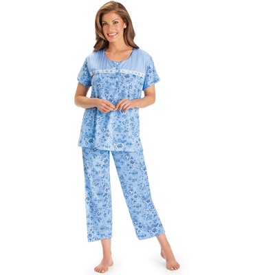 This Lovely Pajama Set Features An All-Over Dobby Pattern On A Lilac Or Mint Background, With A Beautifully Embroidered Border Design. Top Features A Scooped Neckline, Pintuck Bodice And 3/4-Button Placket. Matching Capris Feature An Elasticized Waist For Comfort. Top Is 26"L; Inseam Is 22"L. Machine Wash. Polyester And Cotton; Imported. Color Available In Mint Or Lilac. Size Available In M(10-12), L(14-16), Xl(18-20) Or Xxl(22-24).