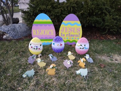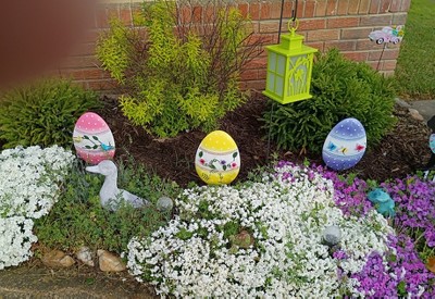 These Easter Egg Garden stakes are beautiful!! Highly visible from the road and I receive many compliments on them. The colors and spring designs are perfect for this time of the year. Bought a set last year and another as a gift this year. Held up very well with rainy weather,