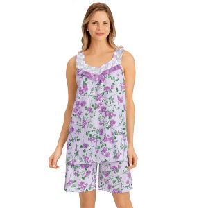 This Comfy Knit Pajama Set Includes A Floral Patterned Sleeveless Top With Shirring, Satin-Like Ruffle And Lace Details, Plus Matching Shorts With An Elasticized Waistband For Comfort. Top Is Approx 30"L And The Shorts Have An 8" Inseam. Machine Wash. Cotton Knit; Imported. 2-Piece Set. Choose: Blue, Mint, Lilac Or Pink. Available In: M(10-12), L(14-16), Xl(18-20) Or Xxl(22-24).