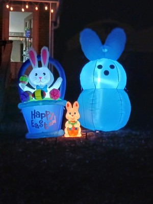 The Easter bunny in a basket inflatable is very cute. Nice bright colors. The white bunny lights well but the dark basket not as well lit. I will use it outside weather permitting. A bit pricey.
