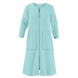 Luxuriously Soft And Cozy, This Textured Plush Robe Features A Full Zippered Front With A Satin Pull, Satin Trim 3/4 Sleeves And Two Satin Trimmed Patch Pockets. Machine Wash. Polyester; Imported. Approx. 42"L. Choose: Pink, Mint, Ivory, Lavender Or Light Blue. Available In: Misses M(10-12), L(14-16) Or Womens Xl(18-20), Xxl(22-24).