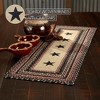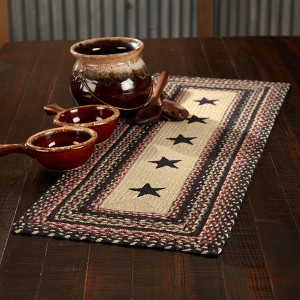 Create a cozy and casual table for friends and family to gather round with traditional colors and classic texture. The Colonial Star Jute Runner includes one table runner made from a premium Jute blend. The rich texture of braided jute is given a primitive feel with a natural tan base infused with rows of country black and bright red that frame a central applique design of five point stars. Complete your tabletop decor with other pieces from the Colonial Star Jute Collection by VHC for modern primitive style.