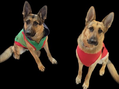 so adorable. I like that it doesn't have sleeves or legs so it seems more tolerable than other options. I went with XXL for my two German Shepherds. the male in green is about 88lbs and the female in red is about 83 or 84lbs. I probably could have gotten away with the XL for her, maybe him too but these will work.