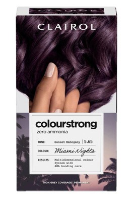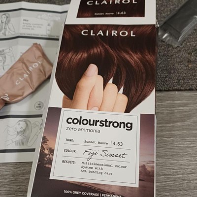 [This review was collected as part of a promotion.] Clairol colour strong dye sunset mauve had everything in the box that I needed to dye my hair. Application was easy to apply and covers well. Not a strong smelling dye. One box covered my medium length hair. Covers grey very well. Love the colour
