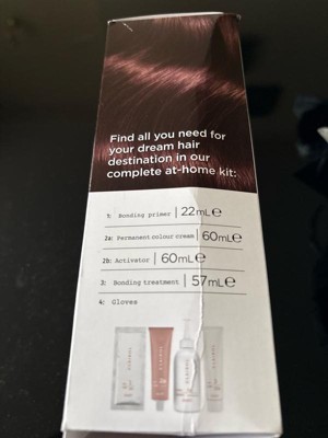 bonding primer: aqua/water, propylene glycol, hydroxyethylcellulose, quaternium-80, sodium diethylenetriamine pentamethylene phosphonate, phenoxyethanol, malic acid, cocamidopropyl betaine, peg-40 hydrogenated castor oil, fragrance, disodium edta, disodium phosphate, polysorbate 60, sodium phosphate, permanent color cream: aqua/water, propylene glycol, ethanolamine, cetearyl alcohol, 2-methoxymethyl-p-phenylenediamine, resorcinol, n,n-bis(2-hydroxyethyl)-p-phenylenediamine sulfate, sodium diethylenetriamine pentamethylene phosphonate, dicetyl phosphate, hydroxyethyl-3,4-methylenedioxyaniline hcl, m-aminophenol, sodium sulfite, ceteth-10 phosphate, 2-methylresorcinol, 2,4-diaminophenoxyethanol hcl, p-aminophenol, steareth-200, 4-amino-2-hydroxytoluene, ascorbic acid, fragrance, trisodium ethylenediamine disuccinate, xanthan gum, citric acid, disodium edta, sodium metasilicate, activator: aqua/water, hydrogen peroxide, cetearyl alcohol, ceteareth-25, salicylic acid, phosphoric acid, disodium phosphate, disodium pyrophosphate, sodium stannate, etidronic acid, bonding treatment: aqua/water, bis-hydroxy/methoxy amodimethicone, stearyl alcohol, cetyl alcohol, stearamidopropyl dimethylamine, malic acid, glutamic acid, fragrance, benzyl alcohol, benzyl benzoate, edta, histidine, cocos nucifera (coconut) oil, sodium chloride, hexamethylindanopyran, hexyl cinnamal, linalool, magnesium nitrate, trimethylsiloxysilicate, aloe barbadensis leaf juice, methylchloroisothiazolinone, magnesium chloride, methylisothiazolinone, ascorbic acid, citric acid, potassium sorbate, sodium benzoate, sodium sulfite' '
