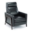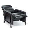 The Maxton Manual Push Back Recliner brings you mid-century modern inspired styling at a great value. This recliner features a trendy exposed wood frame with a high back and pocketed coil seating for ultimate comfort. No levers or buttons keep the silhouette sleek. The innovative leather gel upholstery provides the soft touch of a top grain leather at a great value. Perfect seating for your living room or bedroom where space may be at a minimum. Available in your choice of Midnight Blue, Black or Caramel upholstery. Your purchase includes one manual recliner.
