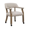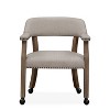 When mobile, comfortable seating is a must, choose the Millstone Castered Game Chair for your home. Solid hardwood construction in a weathered pecan finish with easy to clean soft sand polyester upholstery that blends well with existing decors. Features include smooth rolling ball casters and nail head trim in an antique brass finish.